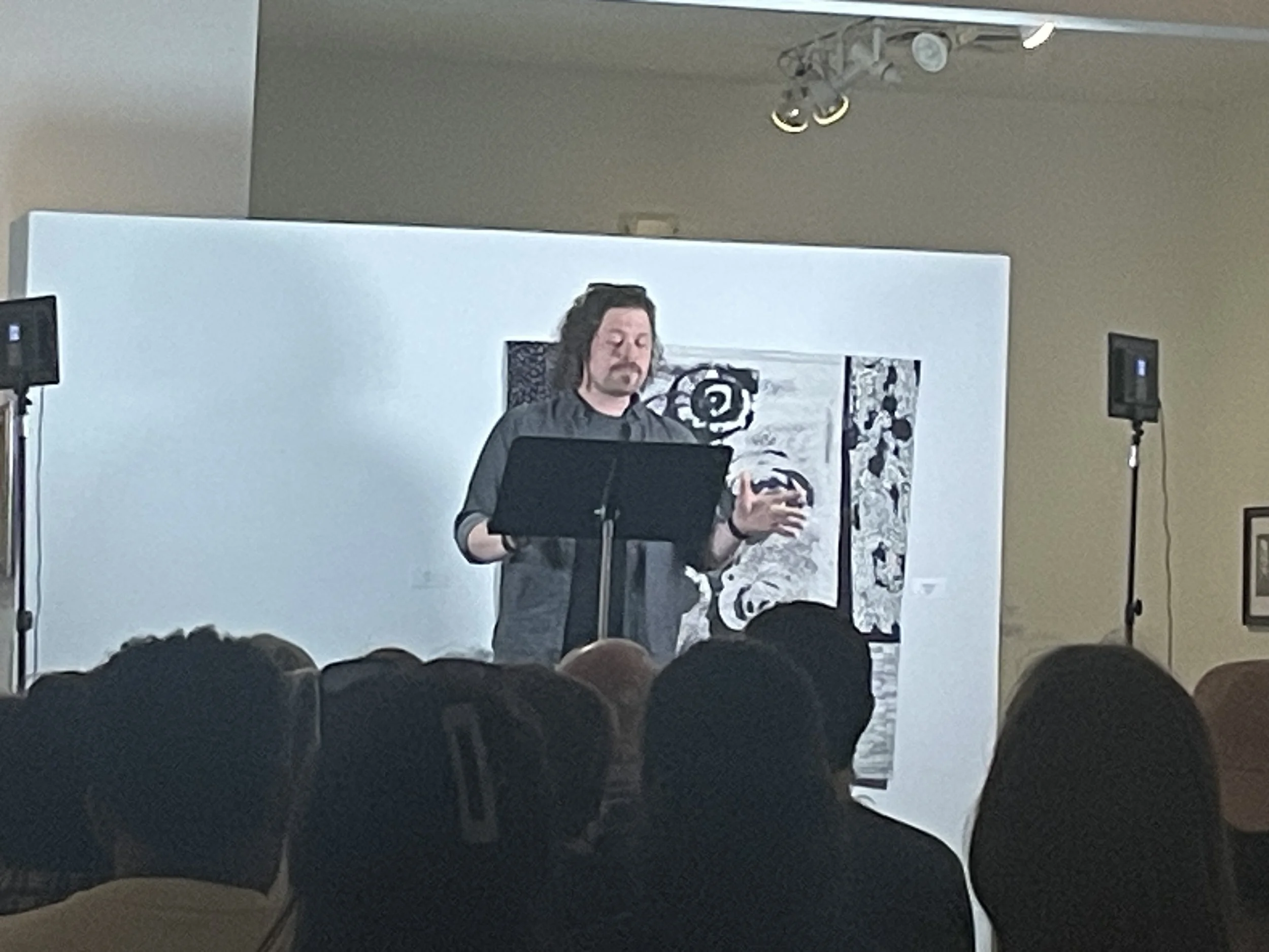 Bo Counts reads a writer submitted story about a smoking monk at a Liar’s Table Storytelling event at Fenix Gallery, Fayetteville, AR.